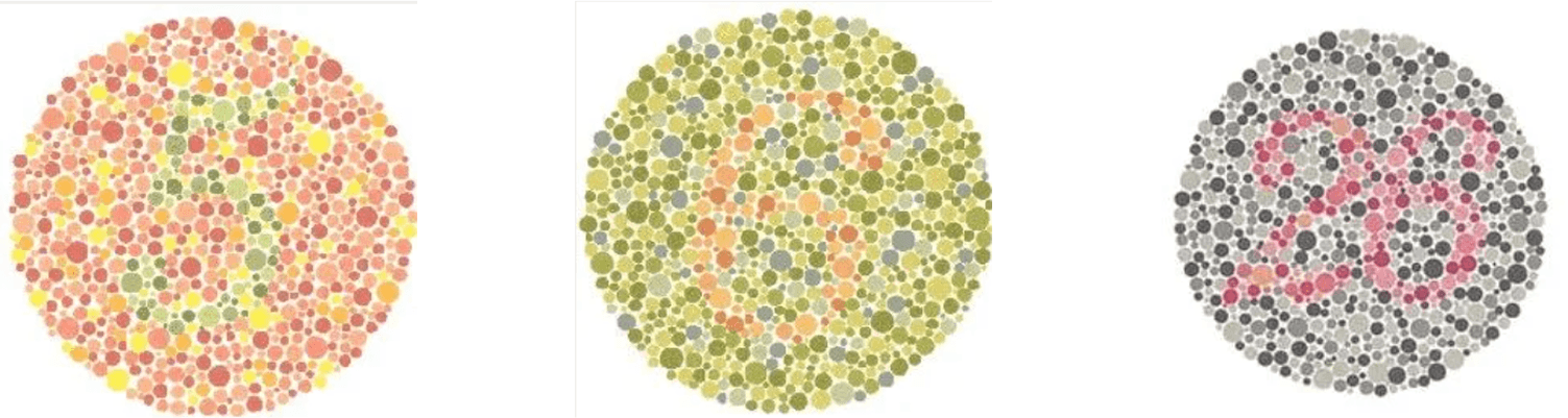 We can determine color blindness through tests like the Ishihara Test. While people with typical color vision see numbers in the circles, those with color blindness may see only a blank circle.