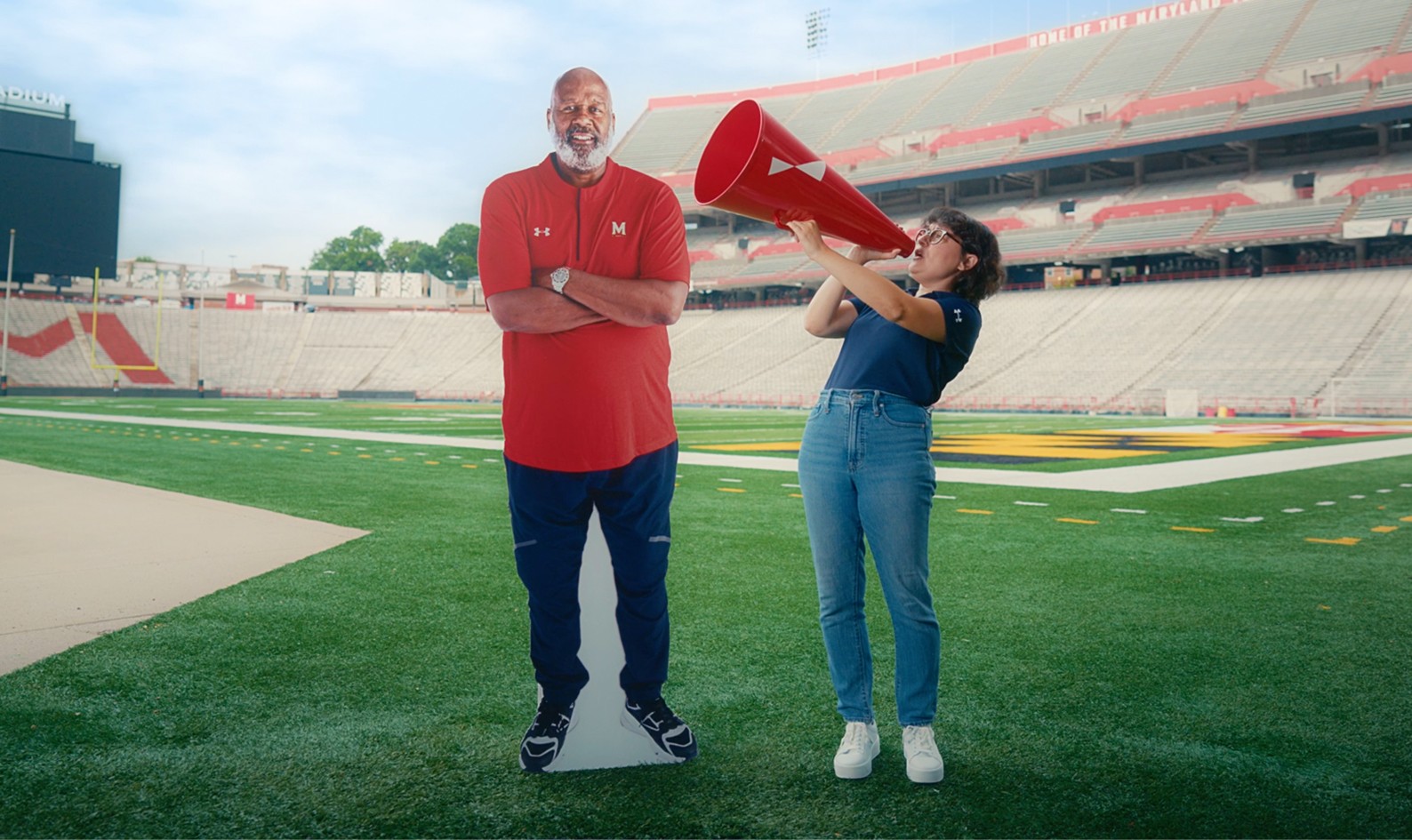 As Sophie highlights the card's fan benefits, the scenes transition to various locations around UMD’s football stadium. There, she unexpectedly encounters the real Coach Locksley, who confidently reinforces her excitement and encourages fans to apply for SECU's Terps card. Turns out, they make a great team.